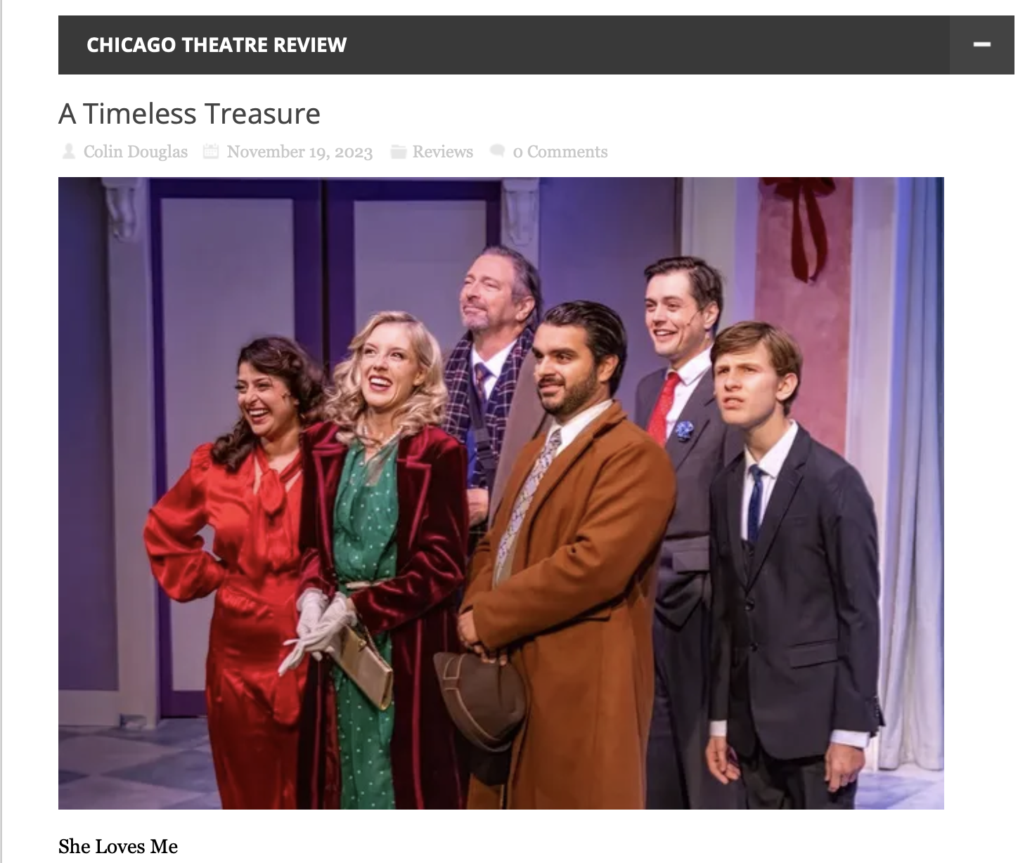 "Kudos to set designer Jeff Award-winner Eric Luchen for his innovative and imaginative sets that rotate from the shop to a bedroom and more and to costume designer Danielle Reinhardt for her beautiful, rich, period-design costumes."